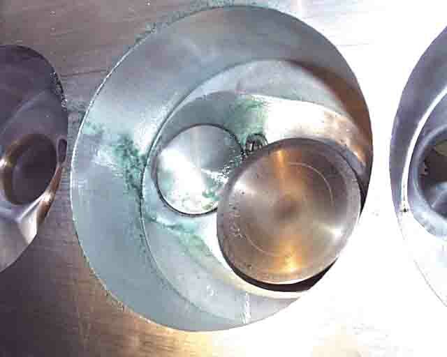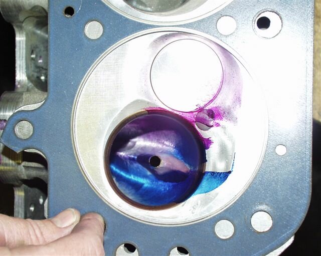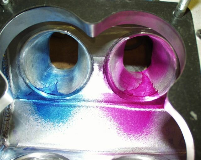 Before the Mondello wet flow bench, this is what we had to do in order to visualize wet flow areas in the induction system and chamber. Spray Dykem in the air and let the port take it in. Any where the dykem left a trail is where the air fuel mixture falls out of suspension. Its very crude to say the least.